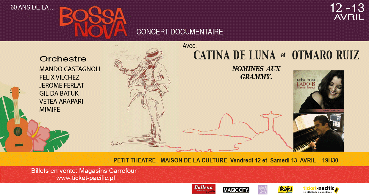 Deux invités internationaux nominés aux Prix Grammy  en 2017,  Catina De Luna, chanteuse brésilienne ,  et Otmaro Ruiz , pianiste vénézuelien ,   installés aux États Unis se joindront à un orchestre de 6 musiciens composé de  Félix Vilchez à la basse, Armando Castagnoli au saxo , Gil Da Batuk  et Jerome Ferlat  du groupe Aquarella , Mimifé à la voix et Vetea Arapari à la percussion . Ils  interpréteront  les trésors du  répertoire brésilien tels que Garota d’Ipanema,  Corcovado , Chega de Saudade  et bien d’autres encore.