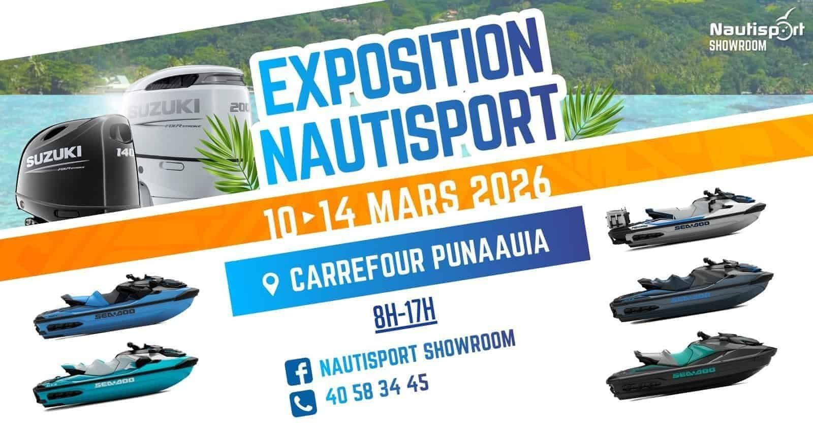 Expo Showroom Nautisport du 10 au 14 mars de 8h a 17h au parking Carrefour Punaauia. Presentation moteurs Suzuki packages bateaux et jets Sea-Doo et offres exclusives salon. Conseils personnalises. Contact 40 58 34 45 ou showroom@nautisport.pf.