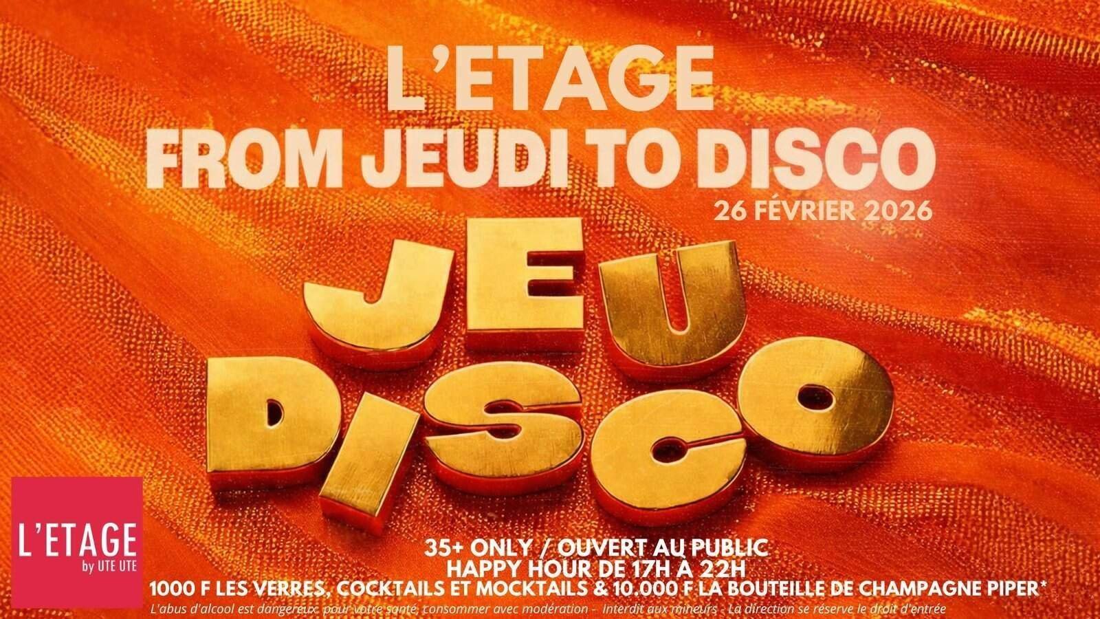 Soiree 100% Disco a L etage by ute ute. Reserve aux 35 ans et plus. Entree gratuite. Happy Hour 17h-22h : 1000F cocktails et mocktails. 10 000F la bouteille de champagne Piper Heidsieck. De 17h a 01h. Interdit aux mineurs.