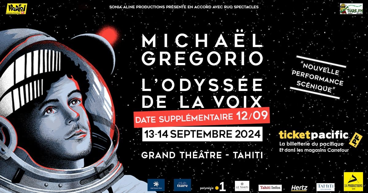 Sonia Aline Productions, Radio 1 et Tiare FM présentent : Michaël Gregorio « L’Odyssée de la voix » au Grand Théâtre les jeudi 12, vendredi 13 et samedi 14 septembre 2024 à 19h30.