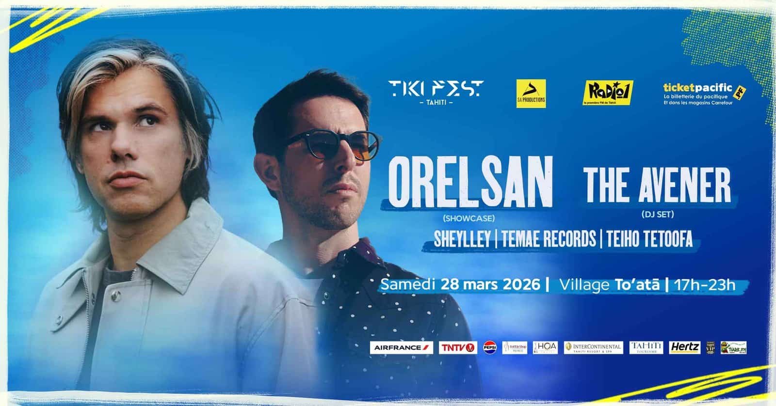 Sonia Aline Productions, Radio 1 et Tiare FM rallument la torche du Tiki Fest pour sa cinquième édition le 28 mars prochain à To’ata avec deux têtes d’affiche exceptionnelles : Orelsan et The Avener ! Sheylley, Temae Records et Teiho Tetoofa complèteront le line-up de cette superbe édition du festival électro organisée pour la toute première fois sur la plus grande scène de Papeete.